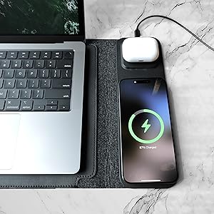 يتيح لك هذا الجراب المحمول المزود بشحن لاسلكي وMagSafe شحن جهاز واحد أو كليهما في آنٍ واحد! استخدم جهاز الكمبيوتر المحمول أو مقبس الحائط للحصول على الطاقة بأقل فوضى.